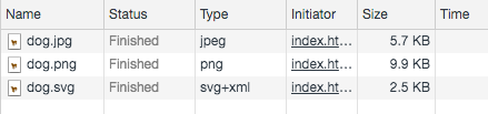 能夠看見Size欄位,同一張照片,從最小到最胖,分別是:SVG的2.5K>JPG的5.7K>PNG的9.9K,最大和最小差快四倍。
